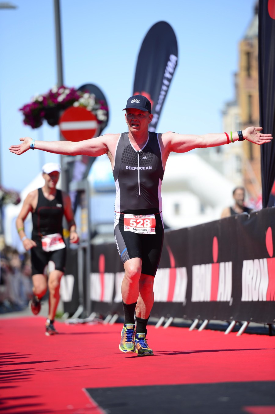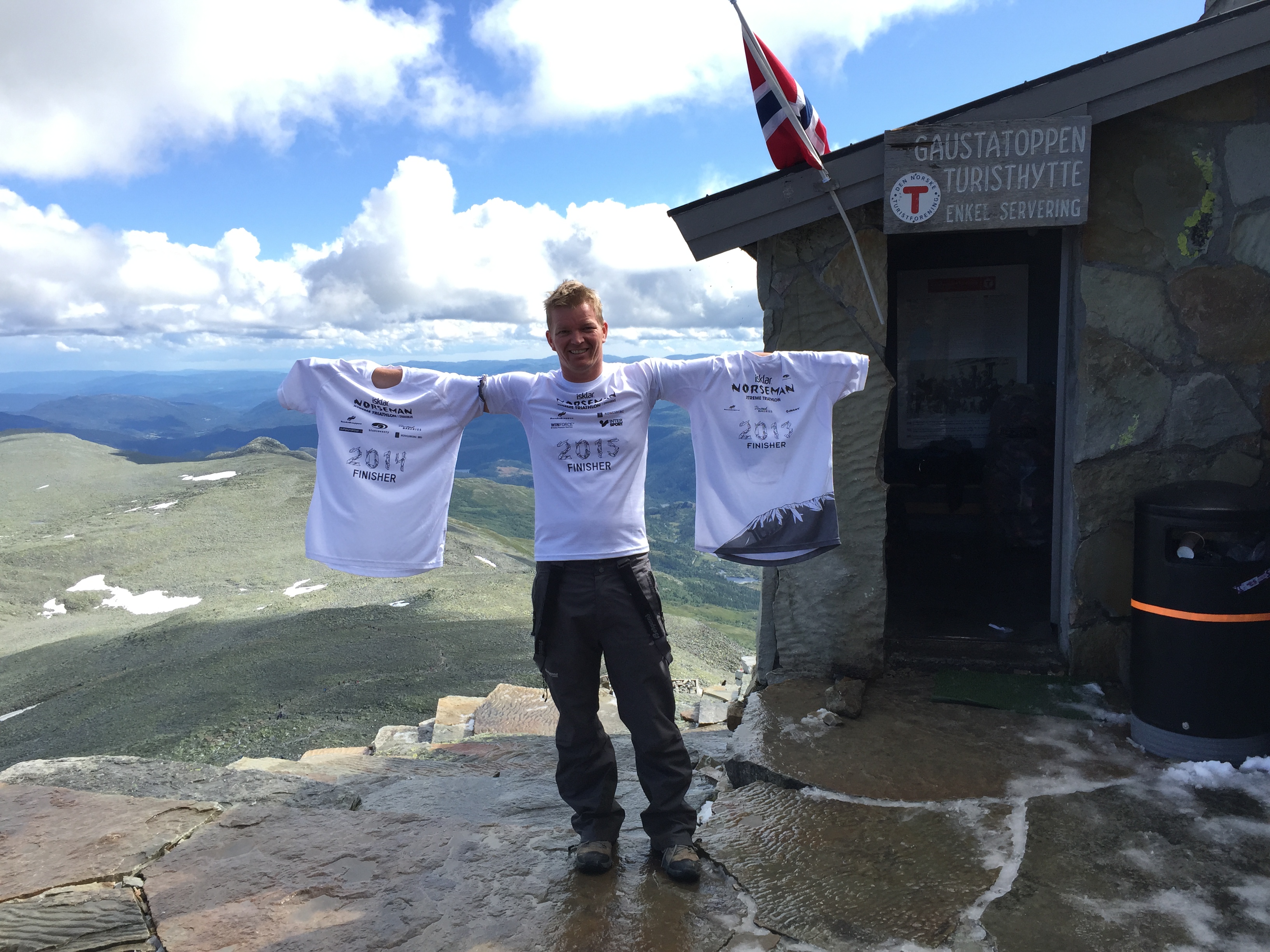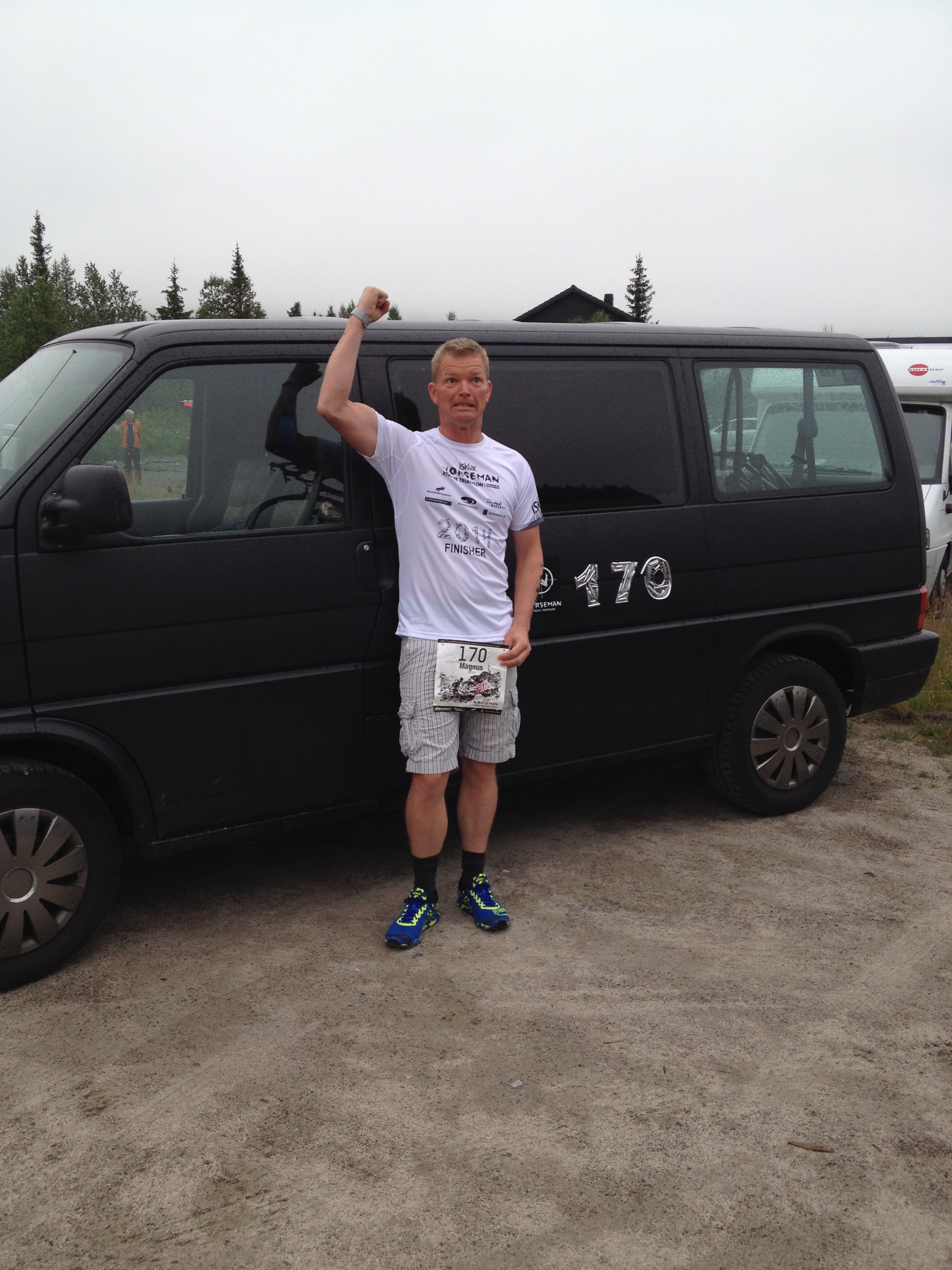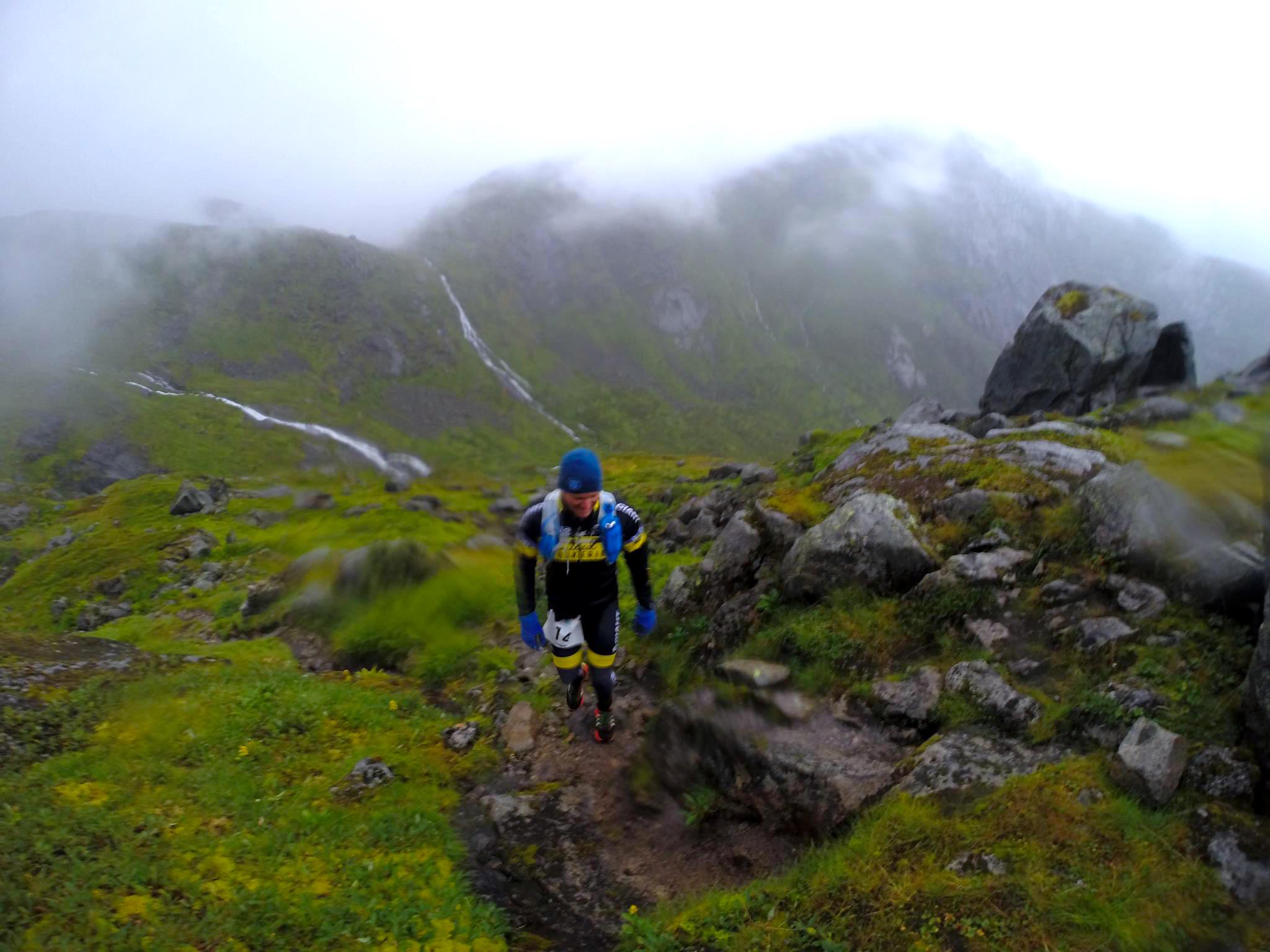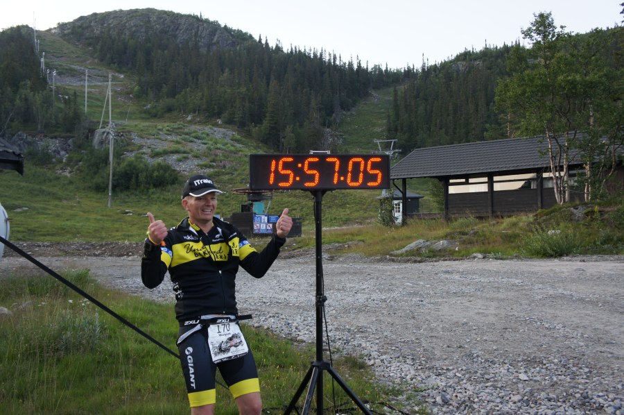 Løpingen blir som det måte bli, rett på 6 tallet i tempo, men det holder seg ganske stabilt på ca 6m20sec/km, som ikke er bra, men greit nok til meg å være. Taper selvsagt plasser nå, selv med friske bein hadde jeg ikke klart å holde de raskeste løperene bak meg, er fort 10.-11. plass. De første 25km går bra, kjemper litt med meg selv innimellom, har jo lyst å gå, men løper, stolpe til stolpe osv. Så er det fjellet, fatter ikke at det kun er litt over fem hundre meter over havet, det føles som flere tusen, og i hvert fall like høyt som Gaustatoppen. Jeg karrer meg over, tar noen bilder underveis, to facebookoppdateringer blir det også. På vei ned igjen kommer første dame sprettende bak meg, hakk i hel har ho tre andre fjellgeiter, skjønner ikke at man kan løpe så fort nedover fjellsidene. Jeg blir chicked og ikke topp ti uansett så jeg prøver å kose meg så godt jeg kan, ikke misforstå, det er ingen kosetur, men alt er relativt. Kommer ned til grusveien og treffer Ingvill, ho ler av meg, fikk vite senere at jeg såg så full ut. Ho følger meg på sykkel frem til neste fjell, Tjeldbergtind, før jeg går over det. Treffer fotograf Kai-Otto oppi der, der også, han er overalt. Poserer, bilder er viktig, husker jo lite av dette uten bilder, ser du en fotograf må du posere, eller late som du er flink i det du gjør. Klatrer ned igjen på andre siden og løper mot mål. Tar en stilfull målgang med flagg og jubel fra uteresturangene. Ruset på opplevelsen, utsikten og atmosfæren er jeg nesten overasket selv over hvor glad jeg er. Herlig å være såppass oppegående i mål, men allikevel vite at man ga alt, bare litt mer kontrollert enn vanlig. Blu kom jo på 13 plass i OL, jeg tenkte at jeg sku være like god som han, men jeg er jo ikke det, så det ble 18. plass på meg. Var i mål på 14t56min altså 3 min raskere enn i Norseman to uker tidligere. Og etter sigende er Lofoten vel så tidkrevende, men det viser vel bare at jeg har rett når jeg sier jeg er bedre på flat sykling enn i bakker. Gleder meg til neste år, sub14 i fint vær må kunne gå.