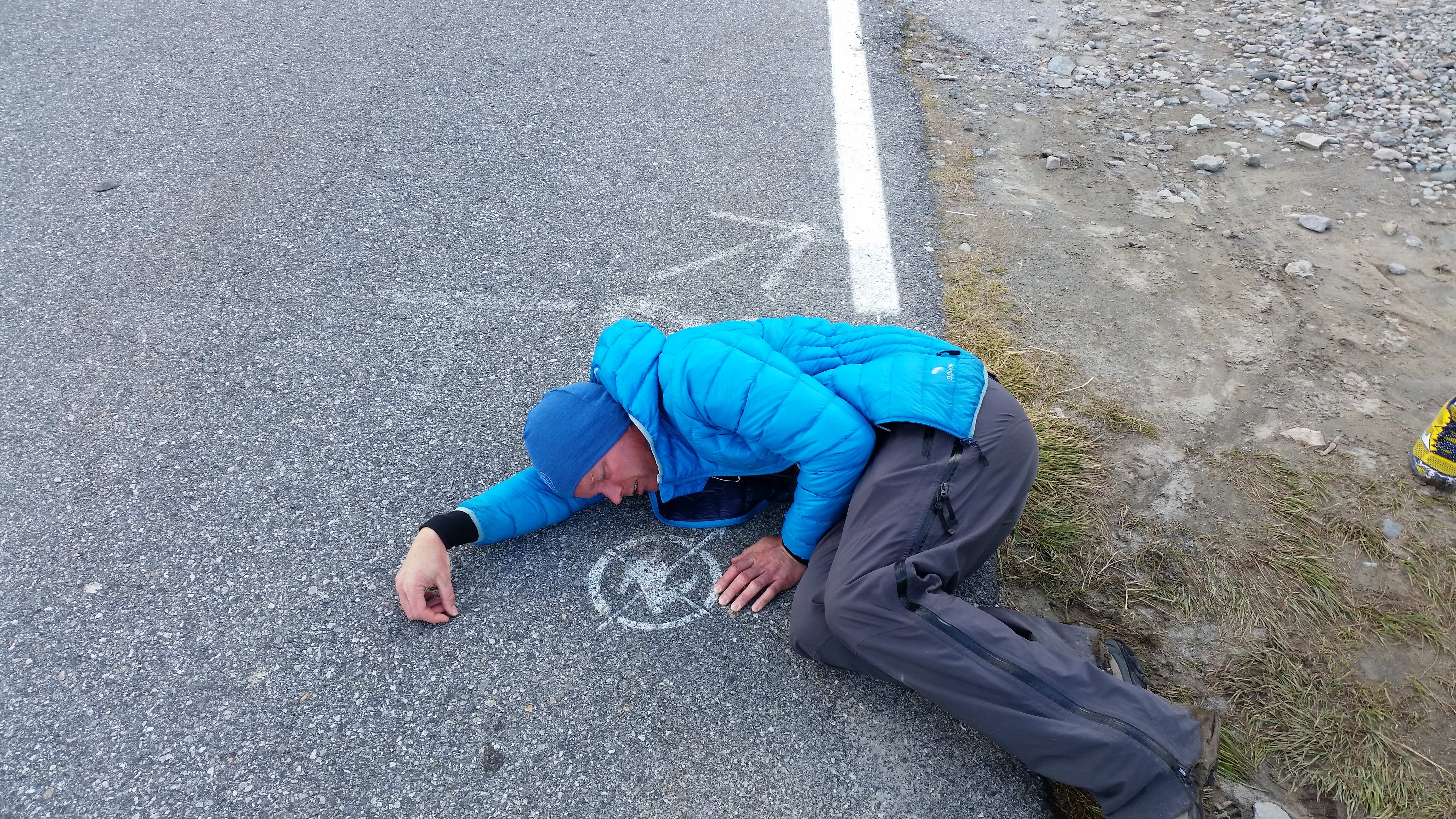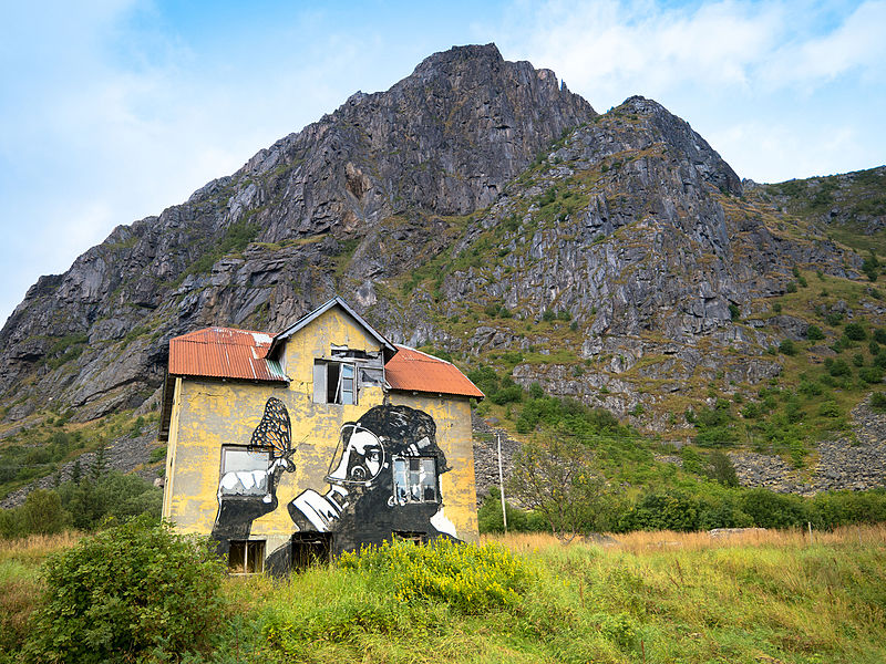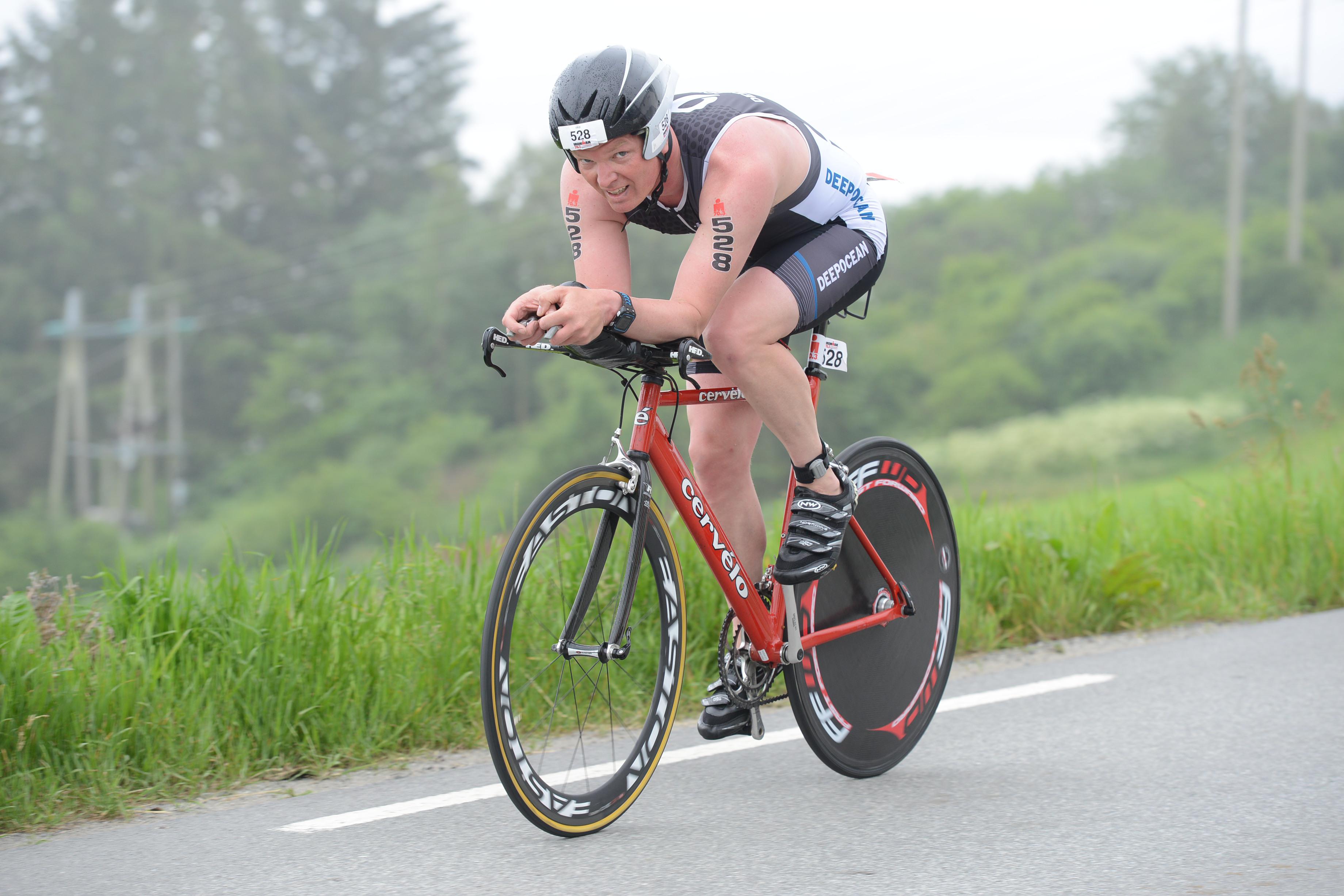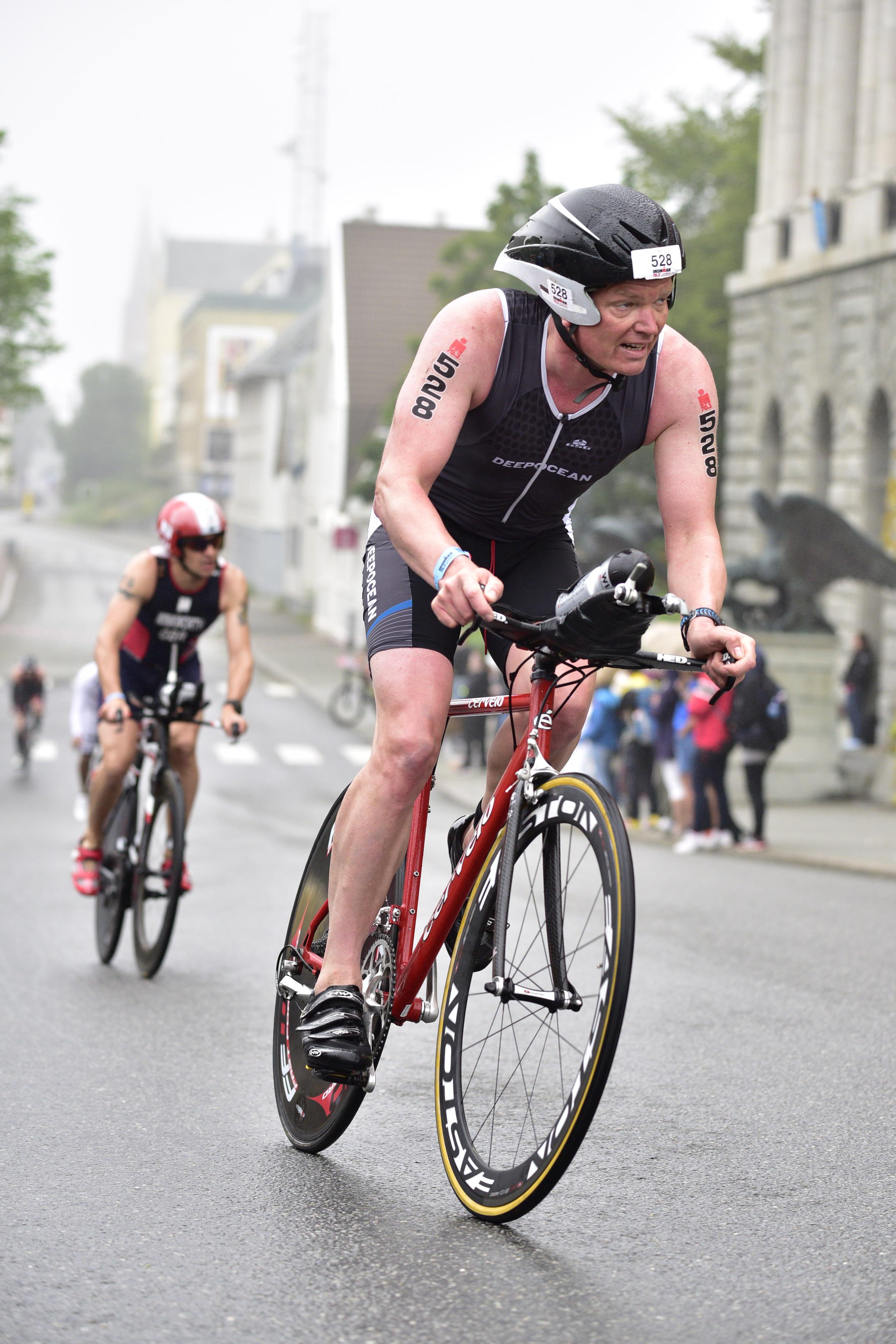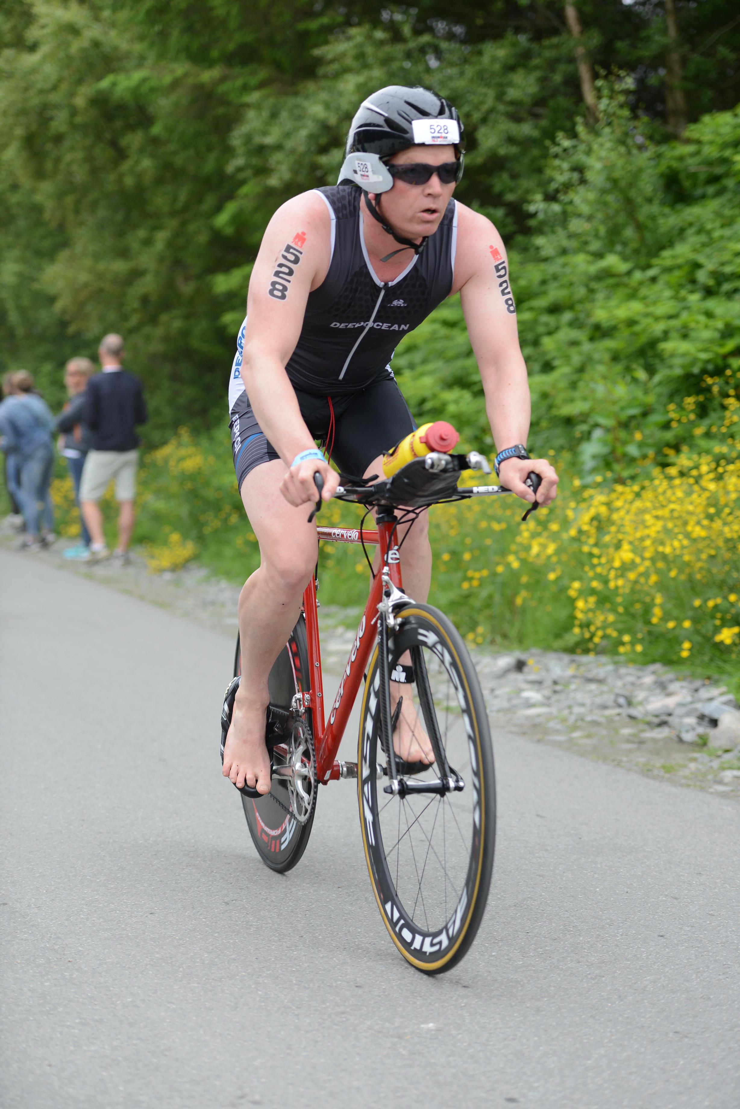 Jeg hadde planer om å prøve noe nytt, sykle superkontrollert på puls og watt, for å se om løpebeina ville holde lengre og at da totaltiden ville gå ned. Det er jo det som er fasiten i skriften, ikke slite seg ut på sykkel. Jeg begynner syklingen rolig, men pulsbeltet mitt fungerer ikke. Det viser seg også at wattmåleren har mistet kalibreringen sin og viser mye mer enn normalt. Jeg må sykle på følelse, men det går jo det også. Vinner noen plasser og taper noen plasser frem til vi nærmer oss Leknes, der blir jeg tatt igjen av Per Anders og jeg klarer å bite meg fast i han. Det er ikke lov å ligge på hjul, men man kan ligge 10m bak. Å ligge på 10m i stedet for å sykle aleine utgjør en utrolig stor forskjell, jeg biter meg fast, er til og med fremme og drar et ørlite stykke, men Per Anders er mye sterkere enn meg, så det er kortvarig glede for han. Han sykler veldig jevnt så jeg klarer å henge på flere mil, ser at farten øker betraktelig, vi sykler ei mil på 16:00 min, altså 37,5 km/t. Vi tar igjen flere stk frem til Leknes og durer videre, jeg ligger langt over planlagt intensitet men ser at det er verd det, farten er så mye større. I et øyeblikks uoppmerksomhet mister jeg plutselig ryggen hans og ligger 20-30m bak i slakk oppoverbakke, jeg har ikke sjangs å henge på lengre, sånn plutselig var det over. Jeg fortsetter å holde trykket oppe og har forandret strategien til å sykle for gull, så får heller løpingen bli som den blir, det er ikke gøy å sykle rolig og kontrollert i en konkuranse. Durer videre og suser forbi Tom Arne et stykke etter Stamsund, dette går fint, nærmer meg Gimsøy og merker jeg hater litt, hater alt, det har kostet å ligge bak Per Anders og det var vanskelig å få i seg næring i denne perioden. Jeg hadde gledet meg til å sykle forbi Pøbel sin gassmaske street art på det falleferdige huset på Gimsøy, husker det så godt fra i fjor, viste ikke at det fantes før jeg plutselig var der. Nå skulle jeg ta meg tid til å kikke nøyere på det, og vist det var noen med kamera i nærheten så hadde jeg planer om å få tatt et bilde av meg foran huset, det var ingen fotograf der, like greit, hatet hele huset. På tide å spise. Spiser flere barer og tømmer drikkeflaska imens jeg hater alle golferne på Lofoten link. Gunther suser forbi meg og snart kommer også Tom Arne og Alexander og tar meg igjen. Energinivået tar seg opp igjen og jeg henger meg på, følger de ut til Henningsvær og tilbake og føler ettehvert at jeg kan dra fra. Gir de en sjangs til å henge på fra Rørvikvatnet men derfra sykler jeg alene inn. Er nummer 7 inn i T2 og i noen minutter nummer 5 etter T2.