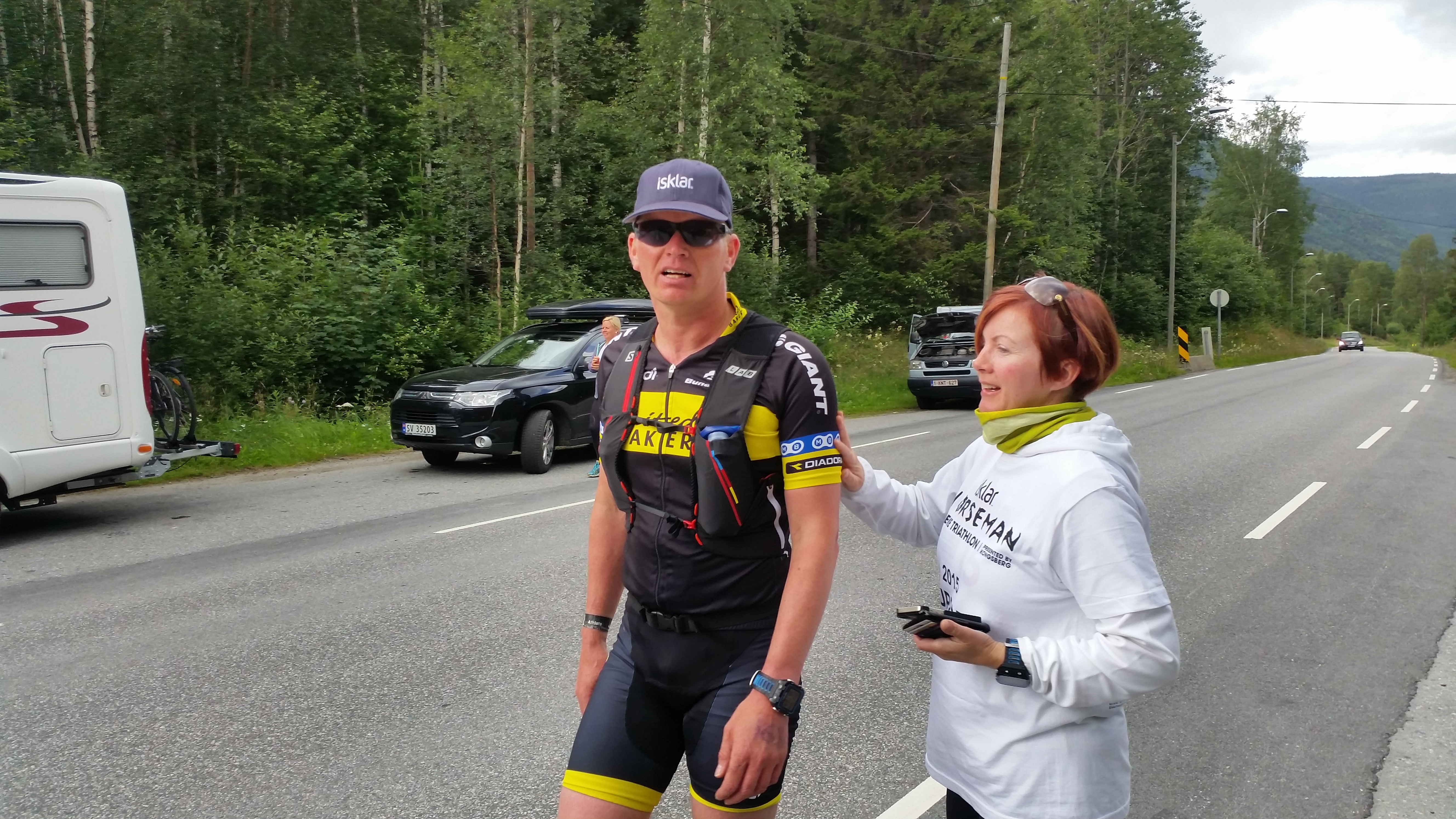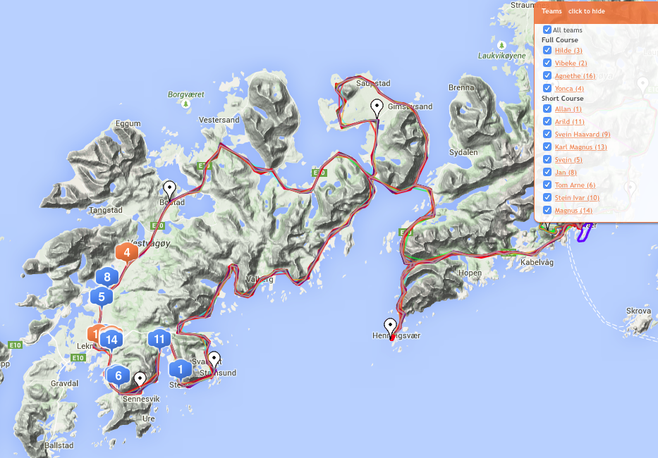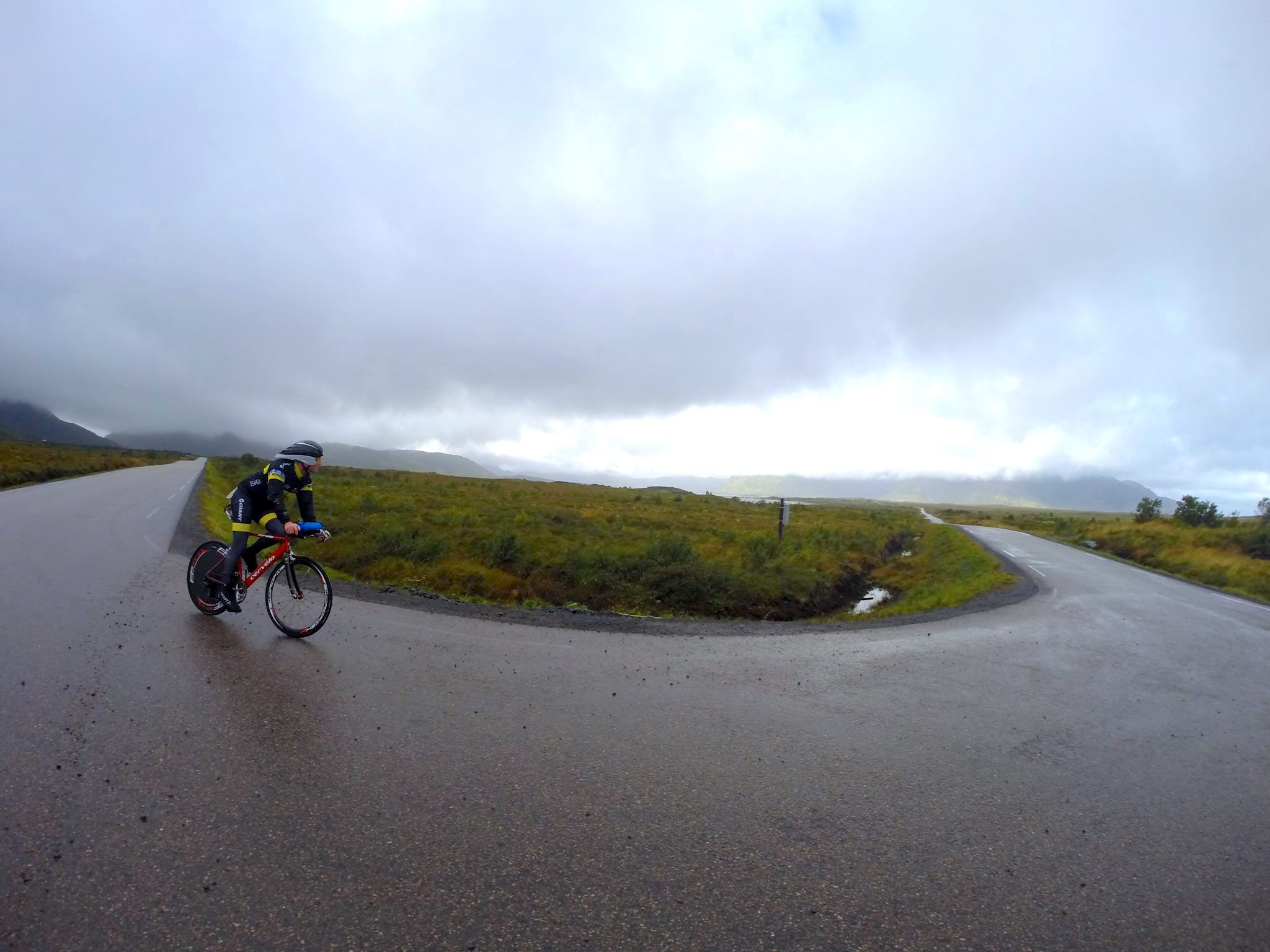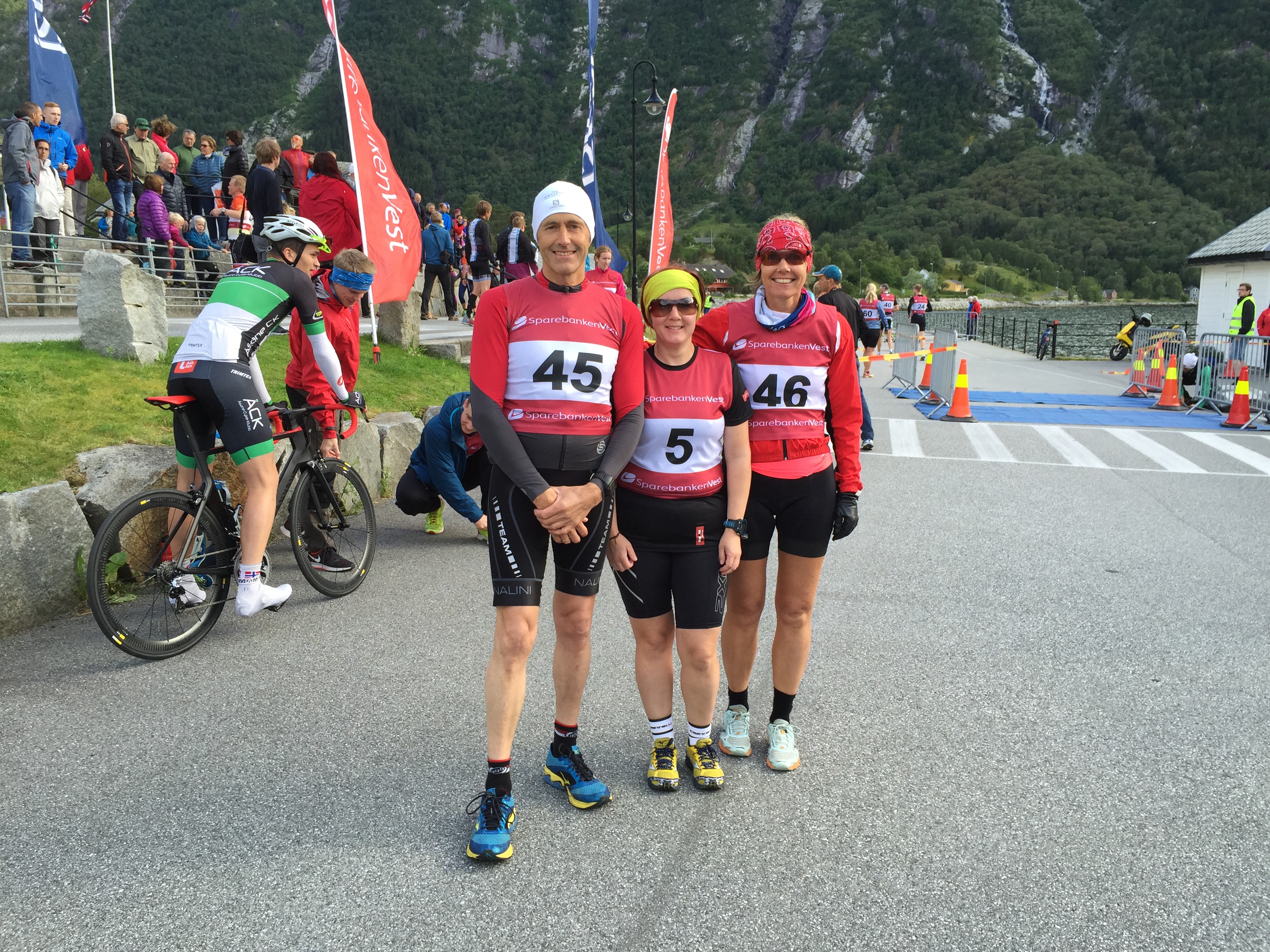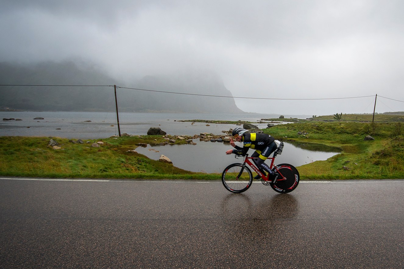Ingvill og de andre sykler til Henningsvær imens jeg leverer kayak og løper for å hente sykkel og sykler etter de for å heie når de kommer tilbake. Ingvill sykler som en konge (dronning) på den nytilpassede, nyombygde sykkelen sin, en BROS Ultimate med flatt styre og tempobøyler. Like rask, men lettere håndterbar enn en racer med bøyler. At en triathlet skal ha bukkestyre i non-draft der man aldri spurter er jo bare tull. På tilbakeveien står jeg der med flagget mitt på sykkelen og blir dagens attraksjon for fotografene.