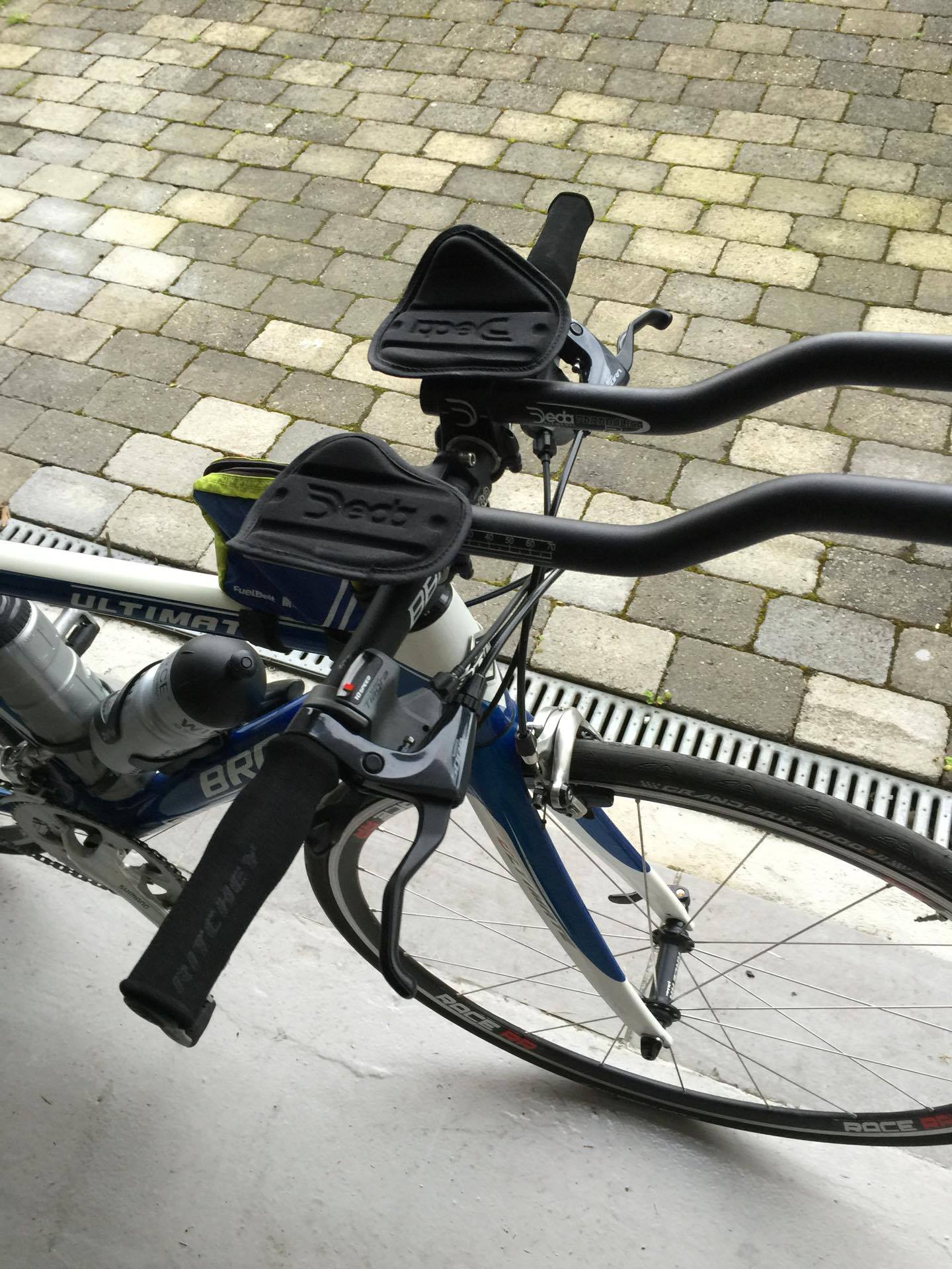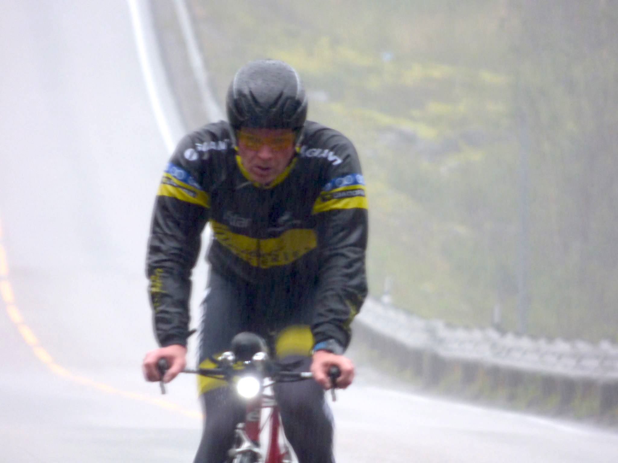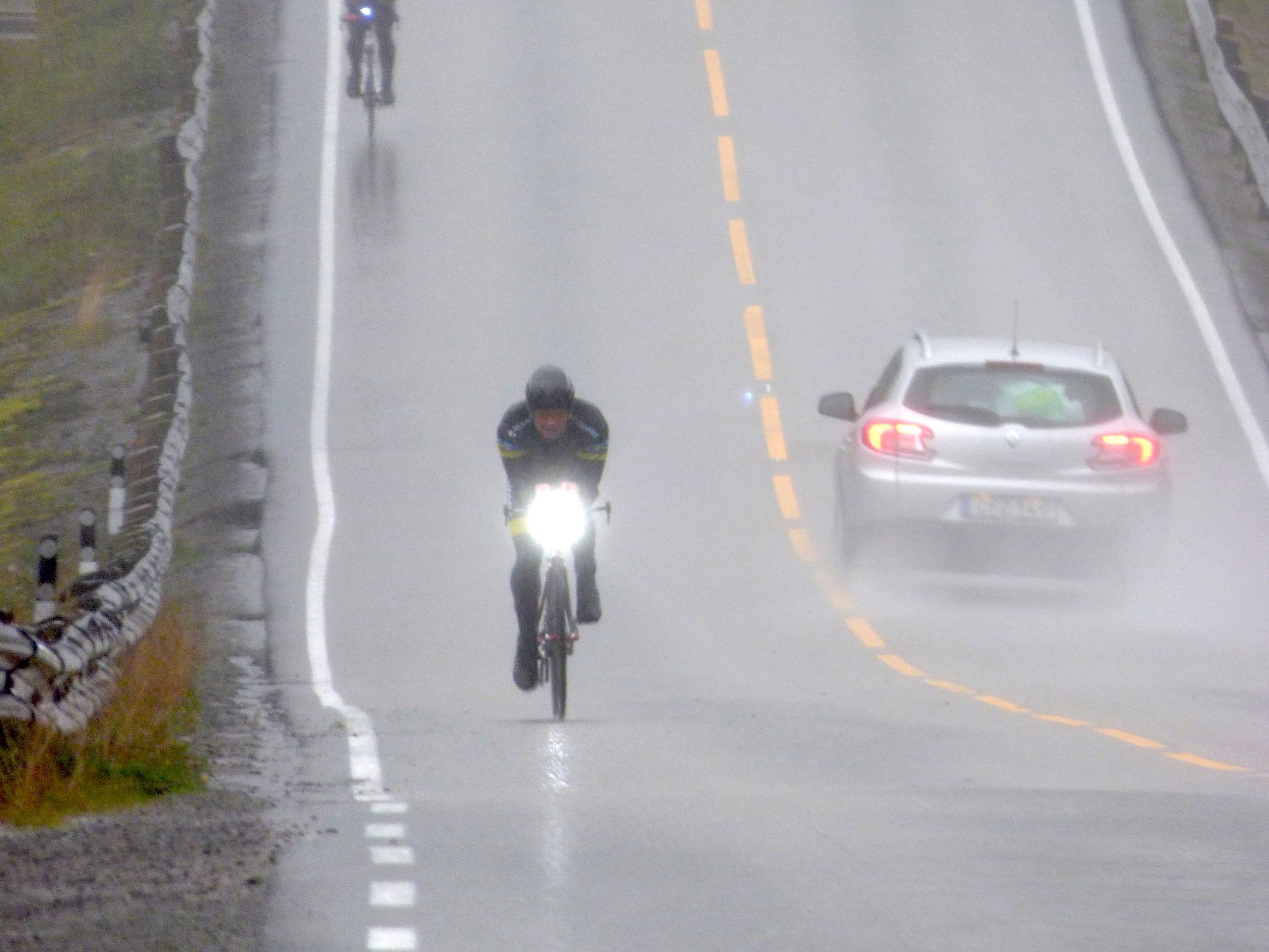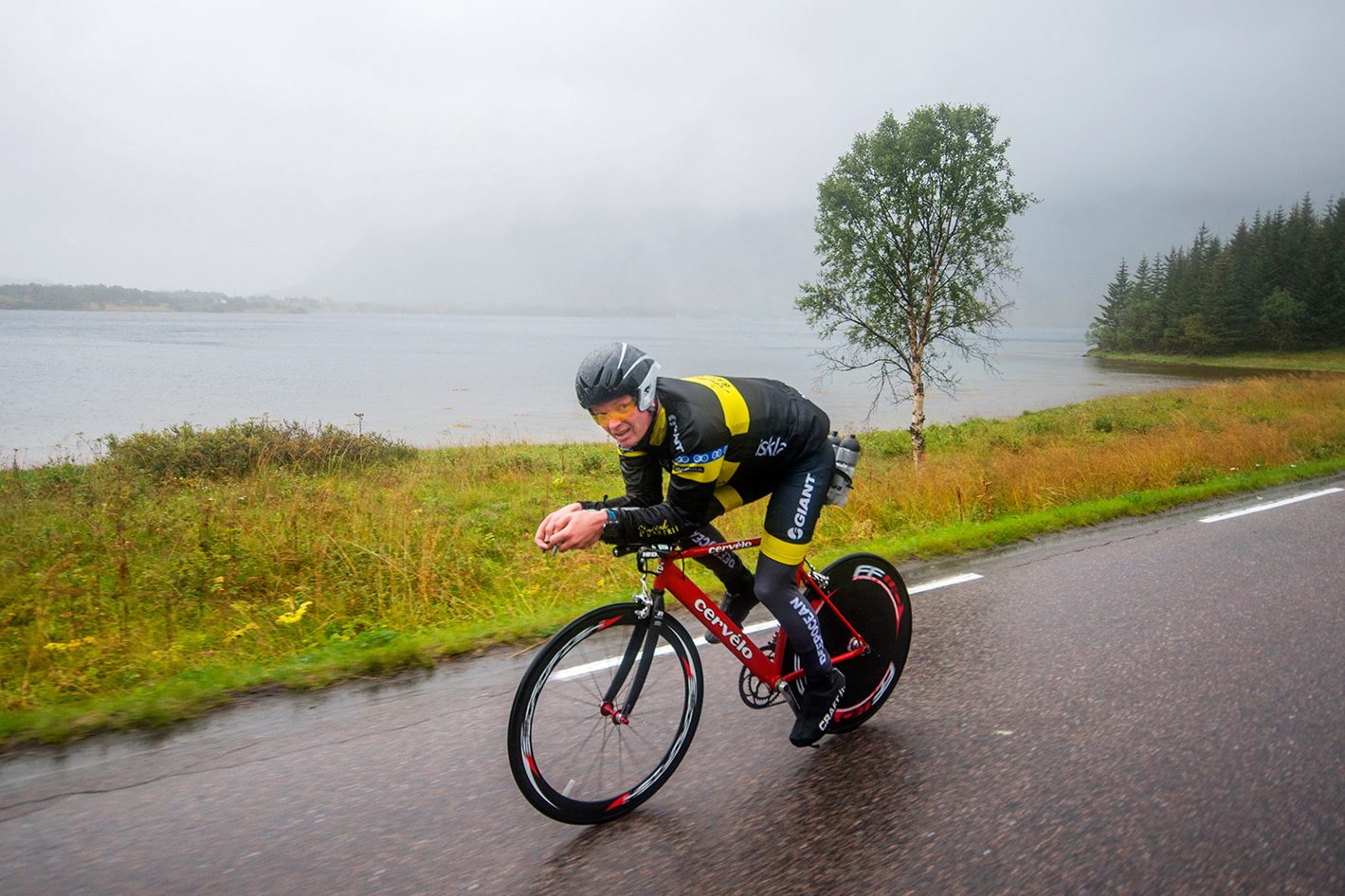 Ingvill og de andre sykler til Henningsvær imens jeg leverer kayak og løper for å hente sykkel og sykler etter de for å heie når de kommer tilbake. Ingvill sykler som en konge (dronning) på den nytilpassede, nyombygde sykkelen sin, en BROS Ultimate med flatt styre og tempobøyler. Like rask, men lettere håndterbar enn en racer med bøyler. At en triathlet skal ha bukkestyre i non-draft der man aldri spurter er jo bare tull. På tilbakeveien står jeg der med flagget mitt på sykkelen og blir dagens attraksjon for fotografene.