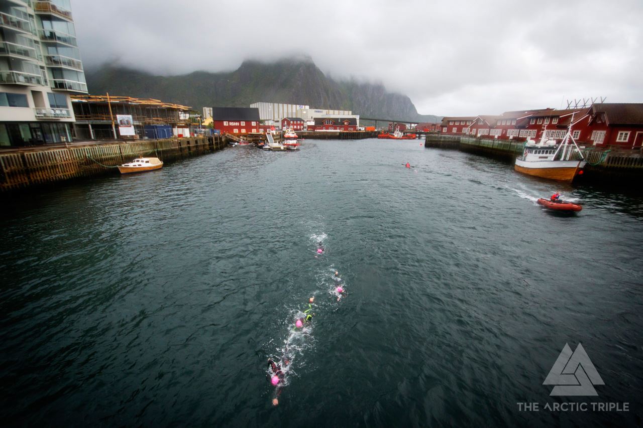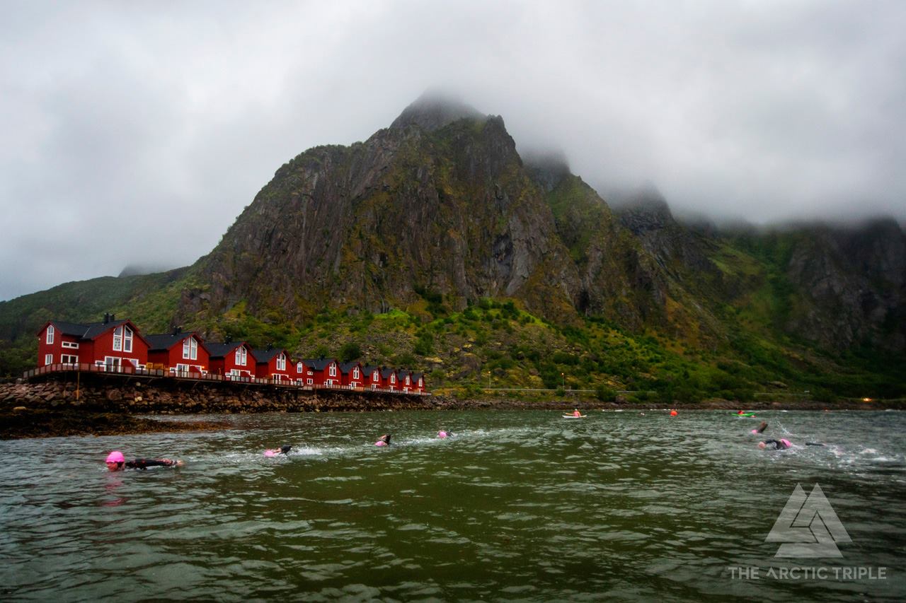 Lørdag er det min tur. Lofoten Triathlon Extreme. Starter 06:00 i Svolvær havn og man svømmer rundt Svinøya, altså uti vestfjorden. Det er nok ikke hver dag man kan svømme der, i fjor var det umulig, men de har ei reserveløype i indre havn dersom været ikke tillater å svømme utsiden. I år er det nesten flatt hav, veldig gode svømmeforhold, nesten 15 grader i sjøen. Lav sol gjør navigeringen noe vanskelig men det går greit. Vurderer å lære meg å svømme bryst i stedet for crawl slik at jeg får se mer av utsikten. Svømmer 4500m på 1t20min, nummer 9 ut av vannet.